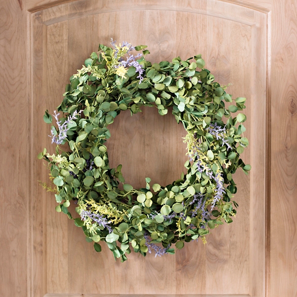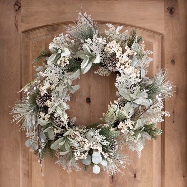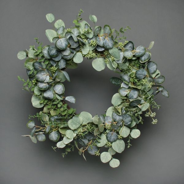 Eucalyptus And Berry Wreath / A combination of several lush green leaves, dotted with dainty white berries, makes up this artificial eucalyptus wreath.